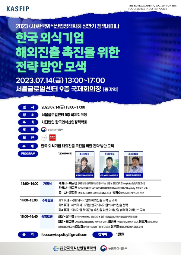 (사)한국외식산업정책학회는 ‘한국 외식기업 해외진출 촉진을 위한 전략 방안 모색’을 주제로 2023년 상반기 정책세미나를 개최합니다.
